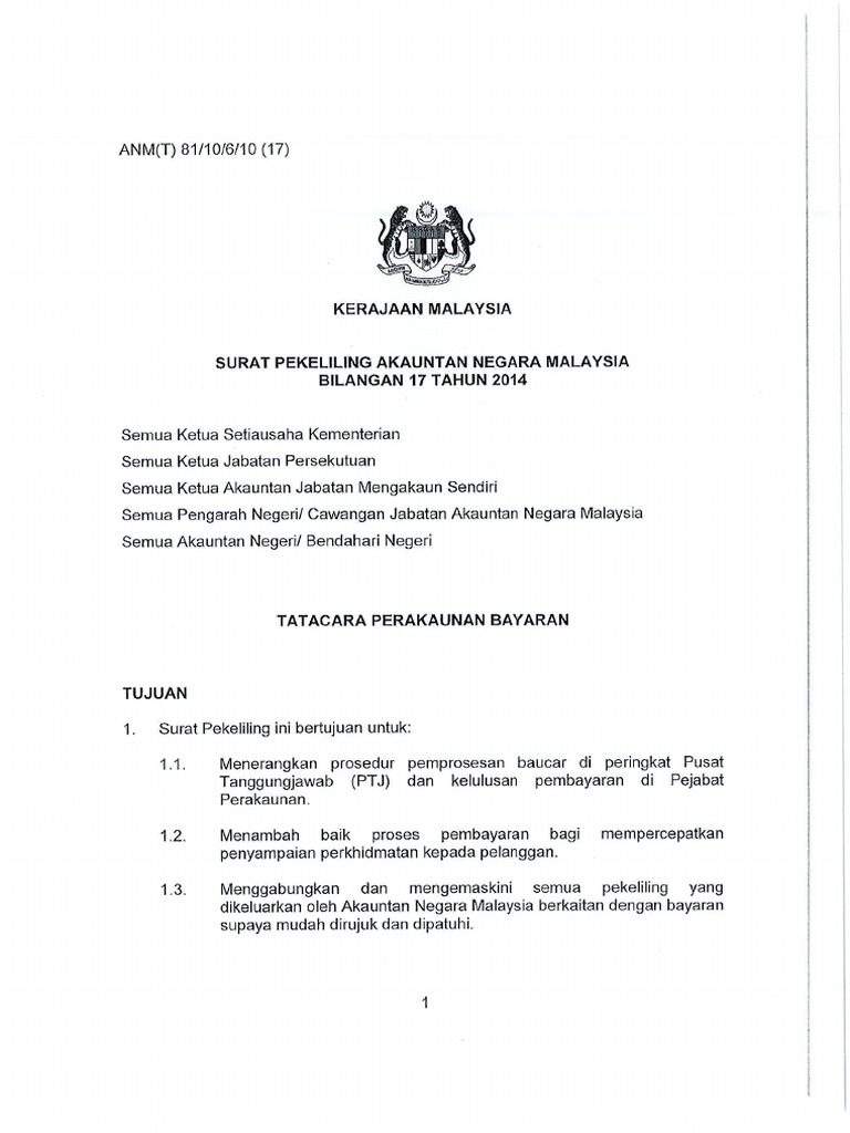 17 Tahun 2014 rujukan ANMT 811061017 bertarikh 17 Disember 2014 berkaitan Tatacara Perakaunan Bayaran adalah dibatalkan.